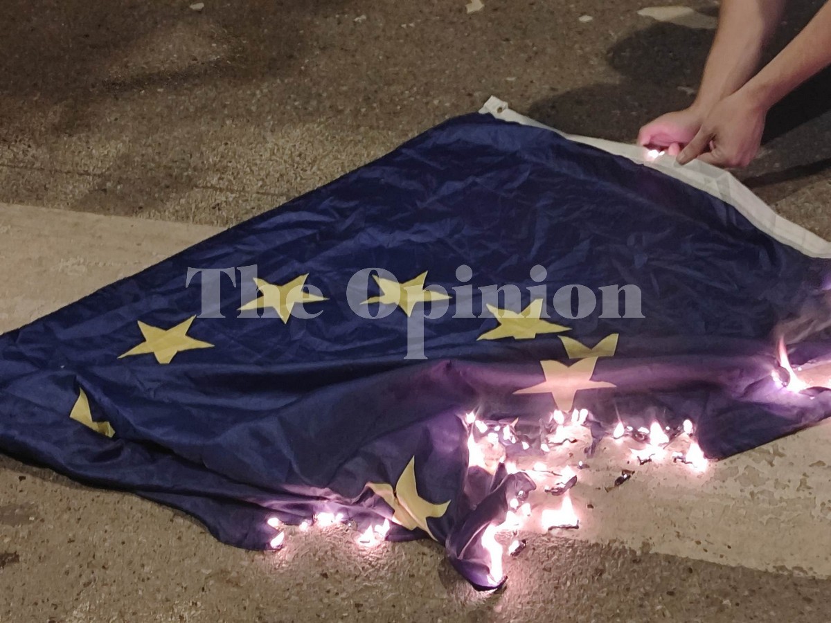 Οι διαδηλωτές προχώρησαν στην καύση των σημαιών ως ένδειξη διαμαρτυρίας για την πολιτική της ΕΕ για τη μετανάστευση και το άσυλο.