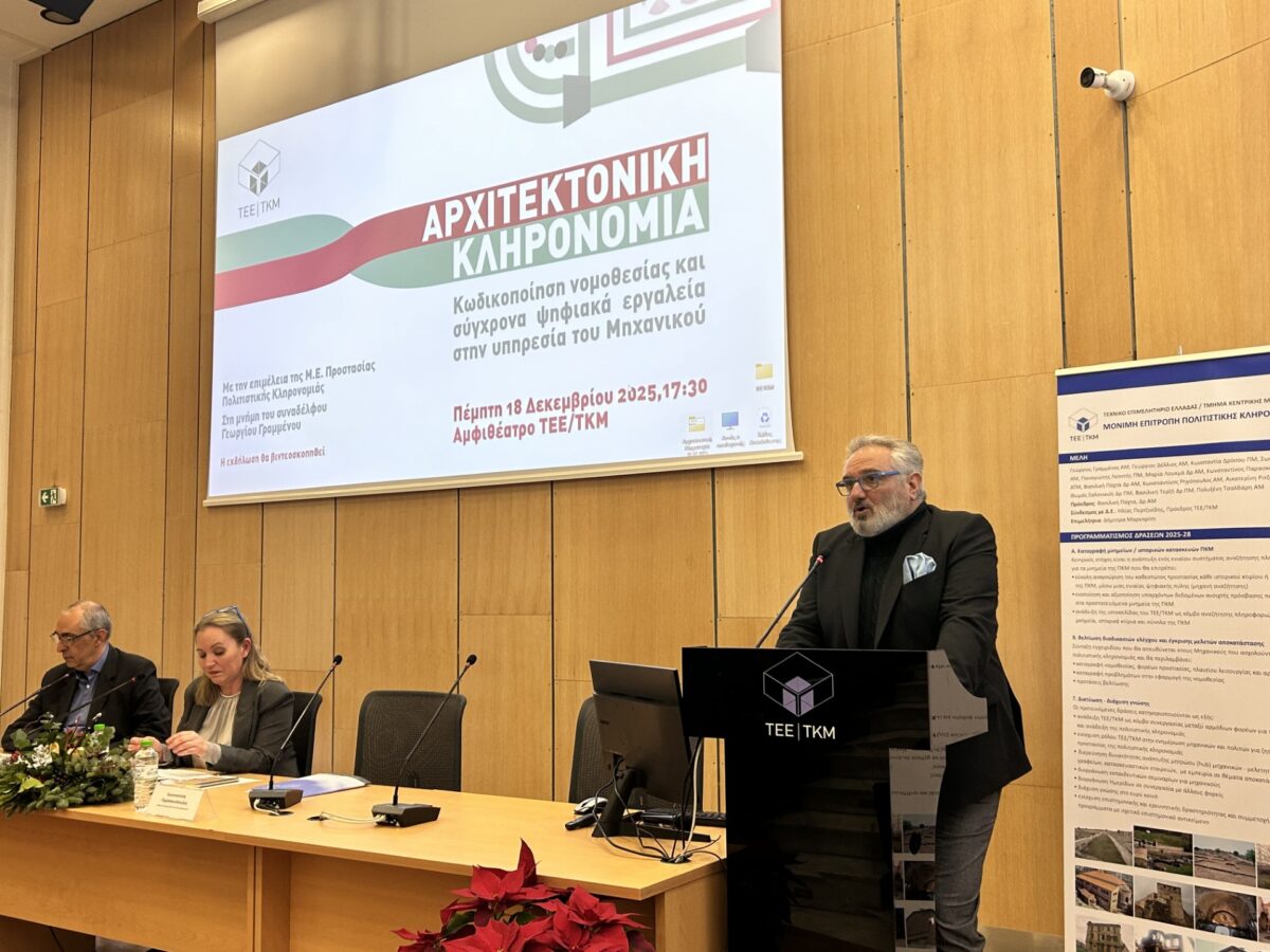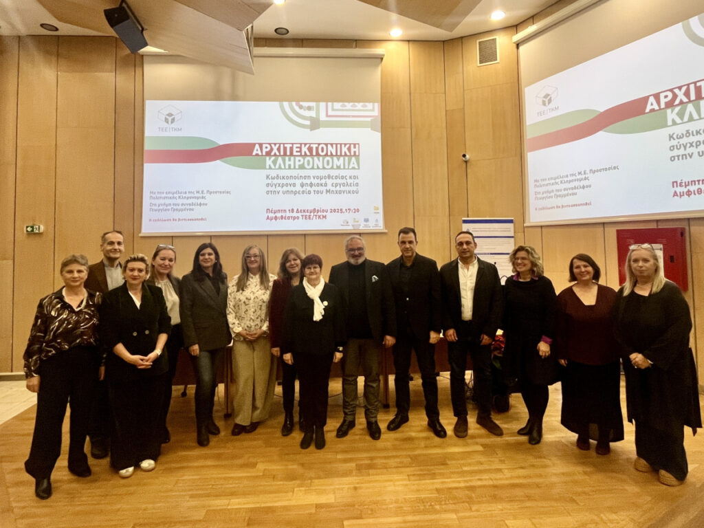 Η ημερίδα με θέμα «Αρχιτεκτονική Κληρονομιά: Κωδικοποίηση νομοθεσίας και σύγχρονα ψηφιακά εργαλεία στην υπηρεσία του μηχανικού» πραγματοποιήθηκε με την επιμέλεια της νεοσύστατης Μόνιμης Επιτροπής Προστασίας Πολιτιστικής Κληρονομιάς του ΤΕΕ/ΤΚΜ και τη συμμετοχή διακεκριμένων επιστημόνων.