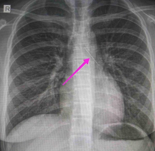 Οι γιατροί προχώρησαν σε απεικονιστική διερεύνηση του περιστατικού υποβάλλοντας την ασθενή σε ακτινογραφία και αξονική τομογραφία θώρακος, όπου διαπιστώθηκε η ύπαρξη του αιχμηρού μεταλλικού ξένου σώματος στην αναπνευστική οδό και συγκεκριμένα στον αριστερό κύριο βρόγχο και όχι στην πεπτική οδό.