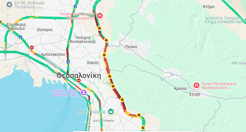 Ειδικότερα,στο ρεύμα προς δυτικά, το μποτιλιάρισμα ξεκινά από την Πυλαία και εκτείνεται μέχρι και την έξοδο για Νεάπολη, ενώ στο ρεύμα προς ανατολικά η κίνηση ξεκινά από το ύψος της Ευκαρπίας πριν το νοσοκομείο Παπαγεωργίου και φτάνει μέχρι και τα Κωνσταντινουπολίτικα.