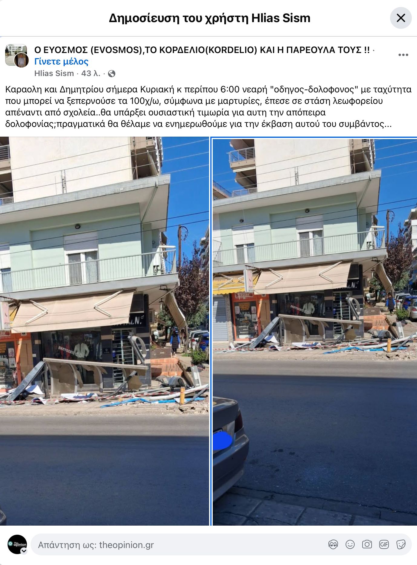 Σύμφωνα με την καταγγελία που ανέβηκε σε σελίδα στο Facebook, η οδηγός έτρεχε με αποτέλεσμα να πέσει επάνω στην στάση του λεωφορείου.