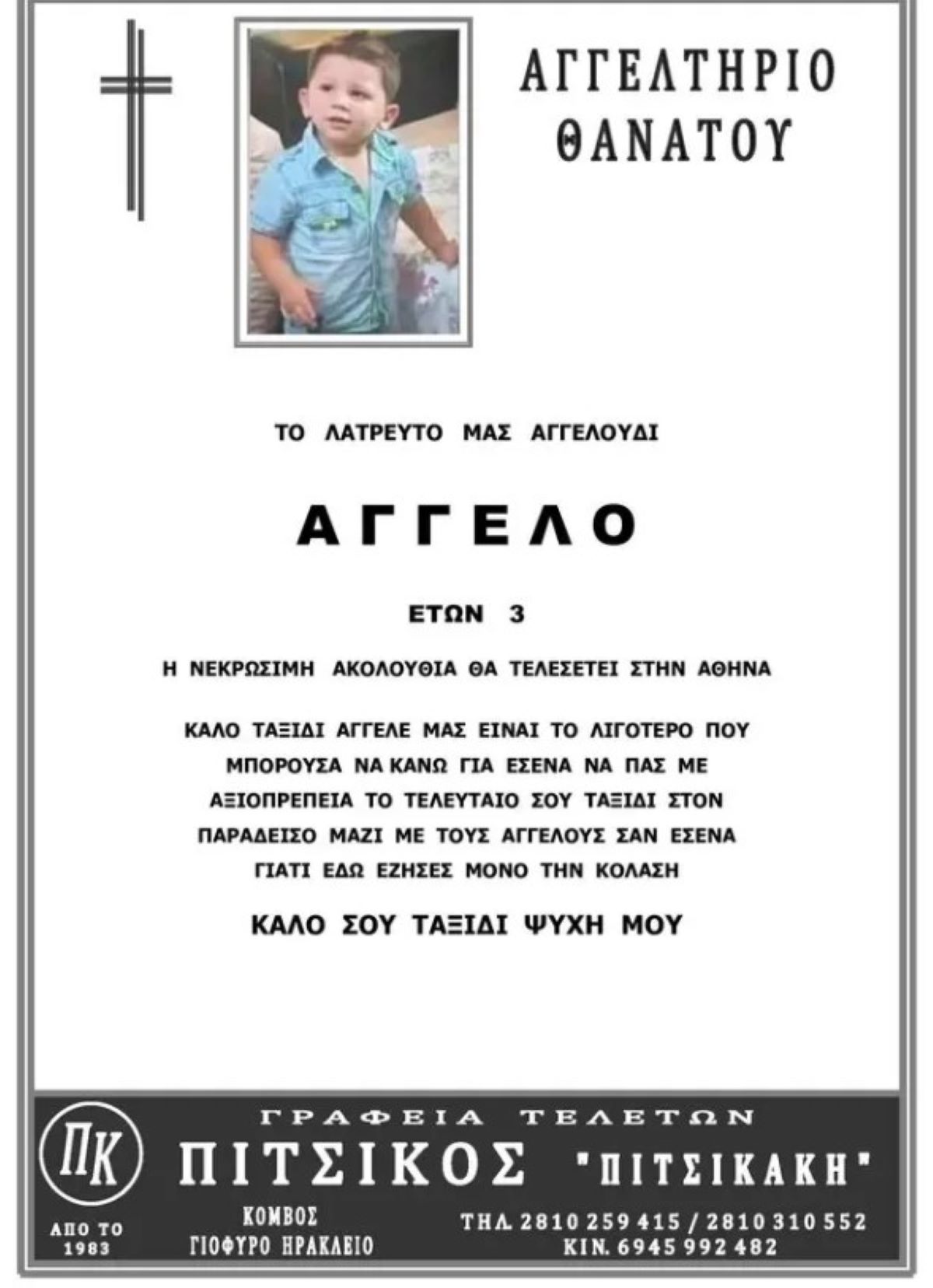 Στο αγγελτήριο της κηδείας του τρίχρονου Άγγελου, από γραφείο κηδειών στο Ηράκλειο, αποτυπώνεται ένα σύντομο μήνυμα γραμμένο σε πρώτο πρόσωπο και αναφέρεται στην κόλαση που έζησε αποτέλεσμα της ανελέητης κακοποίησης που υπέστη από τη μητέρα και τον πατριό του.