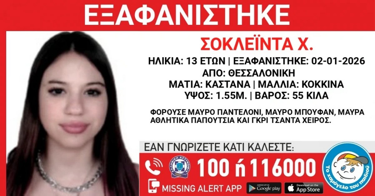 Στις 02/01/2026, βραδινές ώρες, εξαφανίστηκε από χώρο φιλοξενίας στη Θεσσαλονίκη η ανήλικη Σοκλέϊντα Χ., 13 ετών. Το «Χαμόγελο του Παιδιού» ενημερώθηκε σήμερα, 23/01/2026 για την εξαφάνισή της και προχώρησε στη δημοσιοποίηση των στοιχείων της ανήλικης κατόπιν εισαγγελικής εντολής, καθώς ενδεχομένως να συντρέχουν λόγοι που θέτουν τη ζωή της σε κίνδυνο.