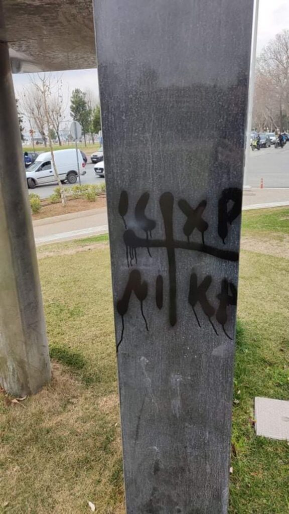 Συγκεκριμένα, οι υπεύθυνοι του Δήμου διαπίστωσαν πως για ακόμα μια φορά (τρίτη ή τέταρτη τον τελευταίο μήνα), άγνωστοι έγραψαν με σπρέι συνθήματα θρησκευτικού περιεχομένου. Είναι γνωστό πως ο διακεκριμένος καλλιτέχνης, Κωστής Γεωργίου, ο οποίος και φιλοτέχνησε το συγκεκριμένο έργο, έχει βρεθεί και παλαιότερα στο στόχαστρο θρησκόληπτων για σειρά γλυπτών, ειδικά στην πρωτεύουσα.