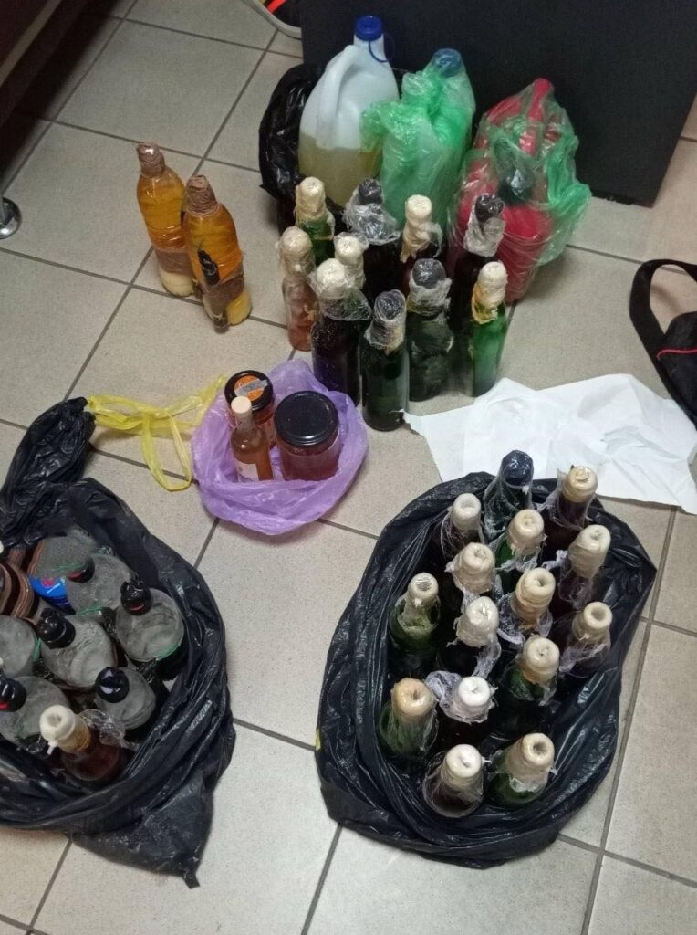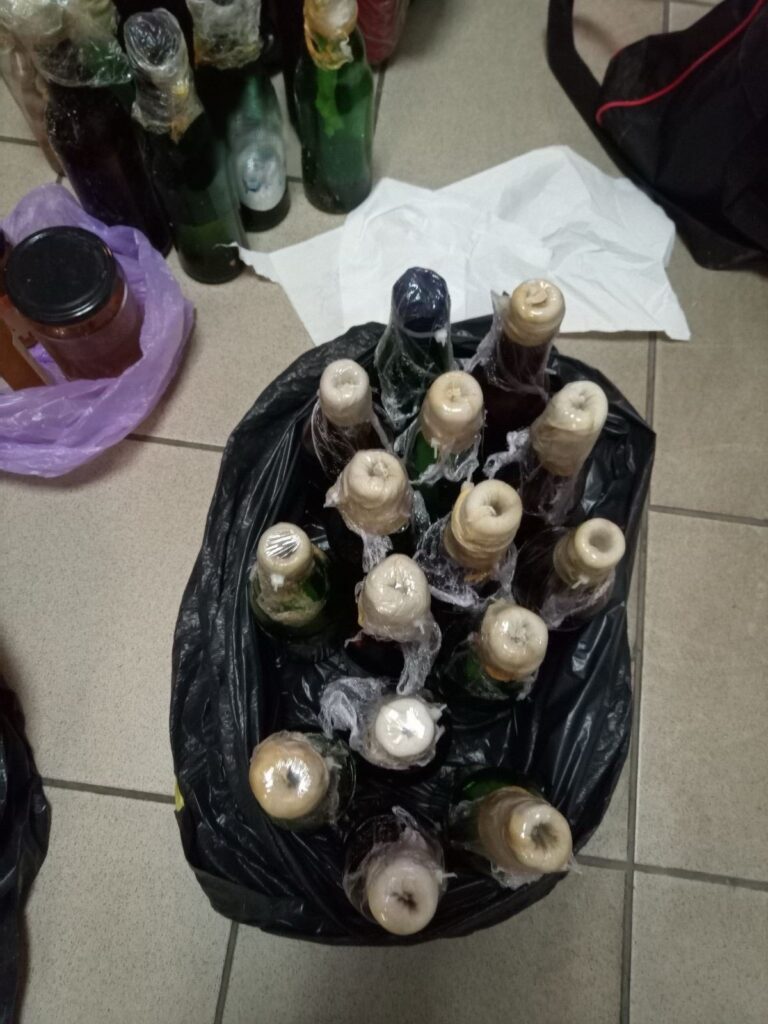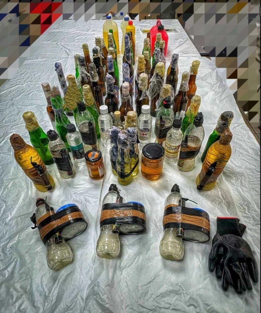 -49 ακέραιες αυτοσχέδιες εμπρηστικές – εκρηκτικές κατασκευές -2 μπιτόνια κενά περιεχομένου με έντονη οσμή εύφλεκτου υλικού -Μπιτόνι με εύφλεκτο υγρό -Ιατρική μάσκα μιας χρήσης -3 ζευγάρια γάντια, κατά περίπτωση, εργασίας και μιας χρήσης -5 σφουγγάρια -3 γυάλινες φιάλες κενές περιεχομένου -4 πλαστικές φιάλες που έφεραν την ένδειξη “Βενζίνη” και -Πλήθος τεμαχίων υφάσματος (ρετάλια).