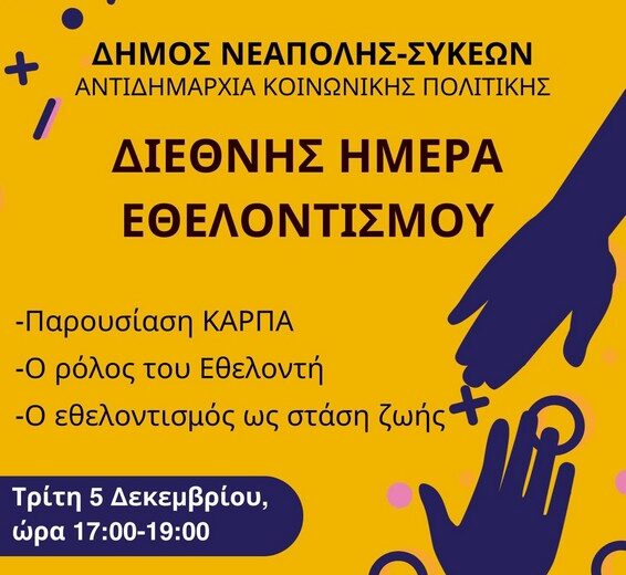 Με αφορμή τη Διεθνή Ημέρα Εθελοντή, ο δήμος Νεάπολης – Συκεών σε συνεργασία με το Κέντρο Ημερήσιας Στήριξης της Οικογένειας – Connect Family, διοργανώνει μία ειδική εκδήλωση, την Τρίτη 5 Δεκεμβρίου, από τις 5 μ.μ. έως τις 7 μ.μ., στο χώρο του Κέντρου (Καραβαγγέλη 9, Συκιές).