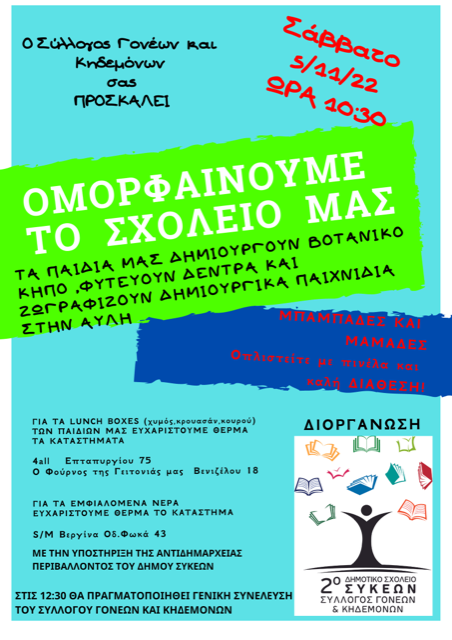 Μια υπέροχη δράση διοργανώνει το Δ.Σ. του συλλόγου γονέων και κηδεμόνων του 2ου Δημοτικού Σχολείου Συκεών το Σάββατο 12 Νοεμβρίου.