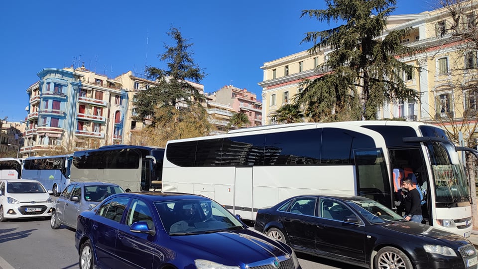 Το κομβόι από την διαμαρτυρία των τουριστικών λεωφορείων κατέληξε στο Υπουργείο Μακεδονίας-Θράκης.