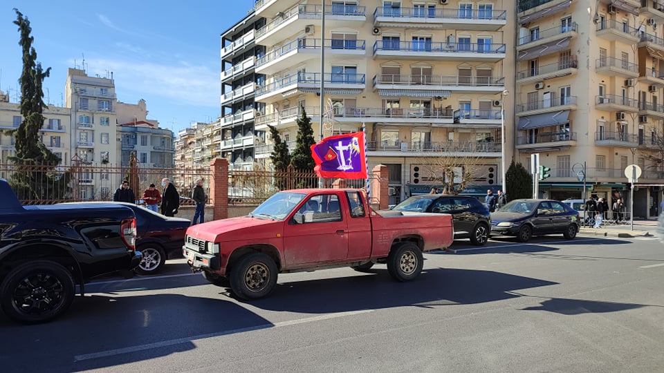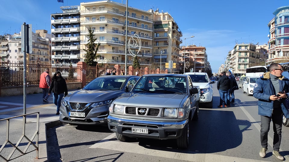 Στο ίδιο σημείο βρίσκονται και αγροτικά αυτοκίνητα, με τους αγρότες να πραγματοποιούν κι αυτοί παράλληλα την δική τους διαμαρτυρία.
