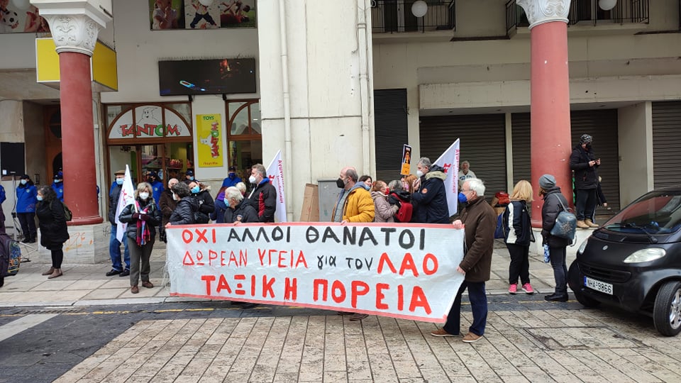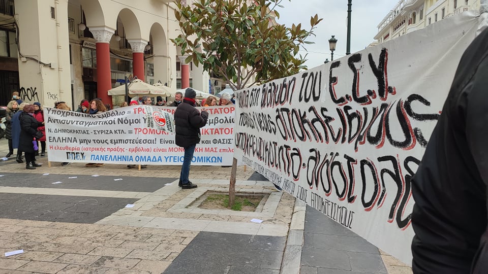 Συγκέντρωση διαμαρτυρίας πραγματοποιείται αυτή τη στιγμή έξω από την Υγειονομική Περιφέρεια στην καρδιά της Θεσσαλονίκης.
