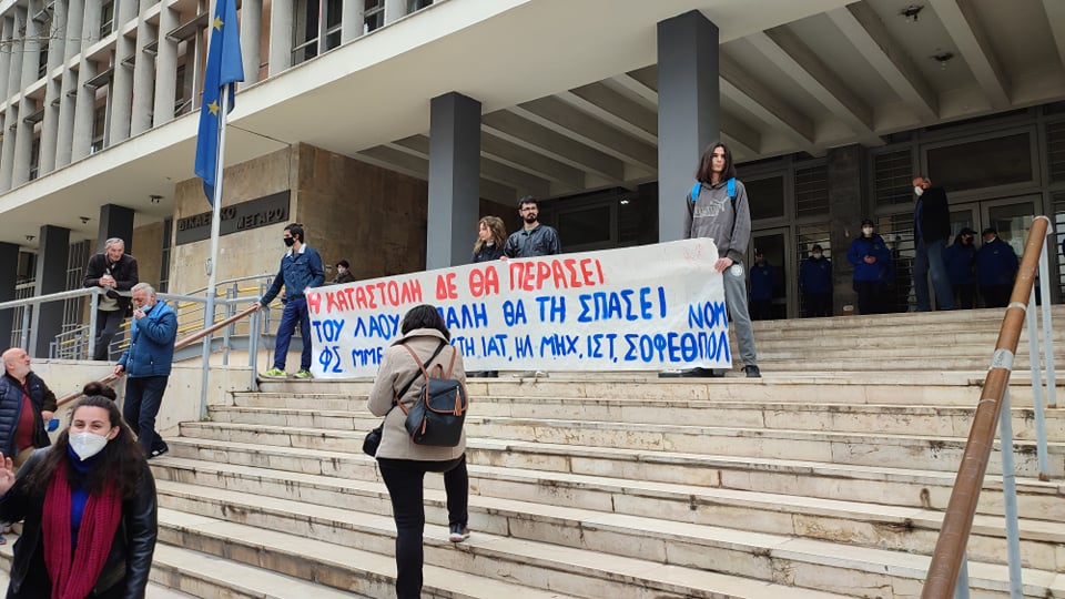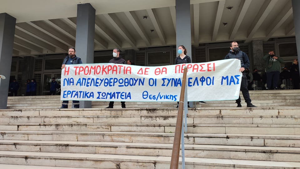 Συγκέντρωση συμπαράστασης πραγματοποιούν αυτή την ώρα έξω από το Δικαστικό Μέγαρο Θεσσαλονίκης μέλη του ΠΑΜΕ και εκπρόσωποι εργατικών σωματείων.