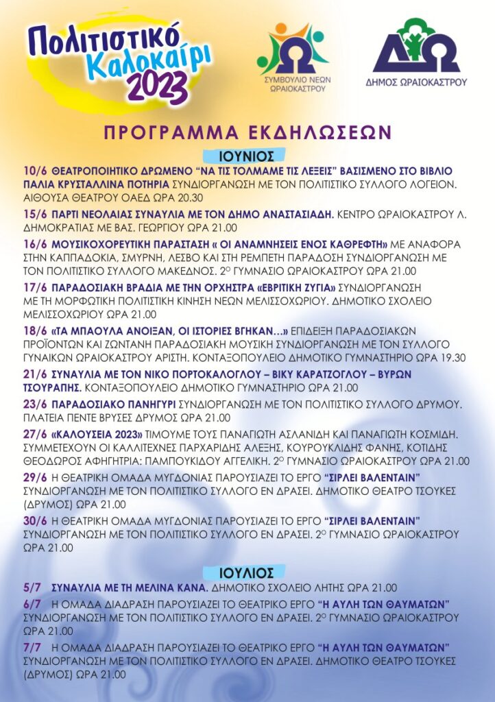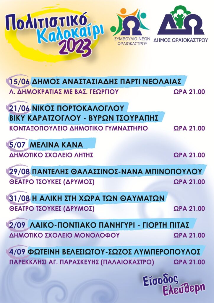 Με αγαπημένους καλλιτέχνες και πλούσιο πρόγραμμα καλλιτεχνικών εκδηλώσεων θα πραγματοποιηθεί και φέτος για τέταρτη χρονιά το «Πολιτιστικό Καλοκαίρι 2023» στον Δήμο Ωραιοκάστρου, το μεγάλο πολιτιστικό γεγονός του καλοκαιριού.