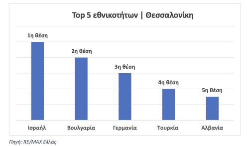 Σύμφωνα με την έρευνα της RE/MAX Ελλάς για το 2025, η πλειονότητα των ξένων αγοραστών στη Θεσσαλονίκη προέρχεται από το Ισραήλ. Στην πρώτη πεντάδα βρίσκονται επίσης Βούλγαροι, Γερμανοί, Τούρκοι και Αλβανοί. Οι περισσότεροι αγοράζουν ακίνητα είτε για επένδυση είτε για χρήση ως δεύτερη κατοικία, εκμεταλλευόμενοι τις ανταγωνιστικές τιμές και την ανάπτυξη της αγοράς.