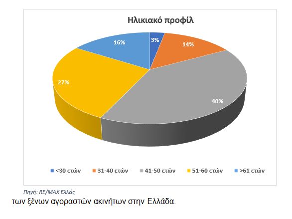 Η πλειονότητα των ξένων αγοραστών ανήκει στην ηλικιακή ομάδα 41–50 ετών (40%), ενώ η κατηγορία 51–60 ετών ακολουθεί με 27%. Οι ηλικίες 31–40 ετών αντιπροσωπεύουν το 14%, οι άνω των 61 ετών το 16%, και οι κάτω των 30 μόλις το 3%. Αυτό δείχνει ότι οι επενδυτές επιλέγουν τη Θεσσαλονίκη ως ασφαλή επιλογή για μακροπρόθεσμη επένδυση ή δεύτερη κατοικία.