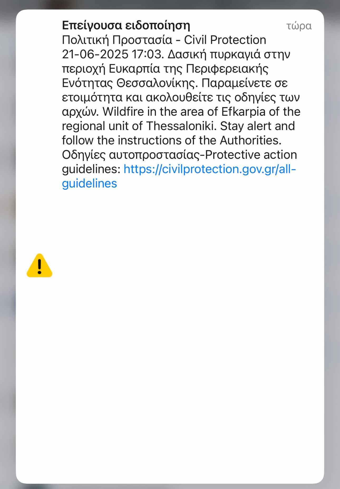 Λίγο μετά τις 17:00 το απόγευμα του Σαββάτου, εστάλη μήνυμα από το 112 πριν λίγο στους κατοίκους που βρίσκονται σε κοντινές περιοχές που καίει η φωτιά στην περιοχή της Ευκαρπίας.