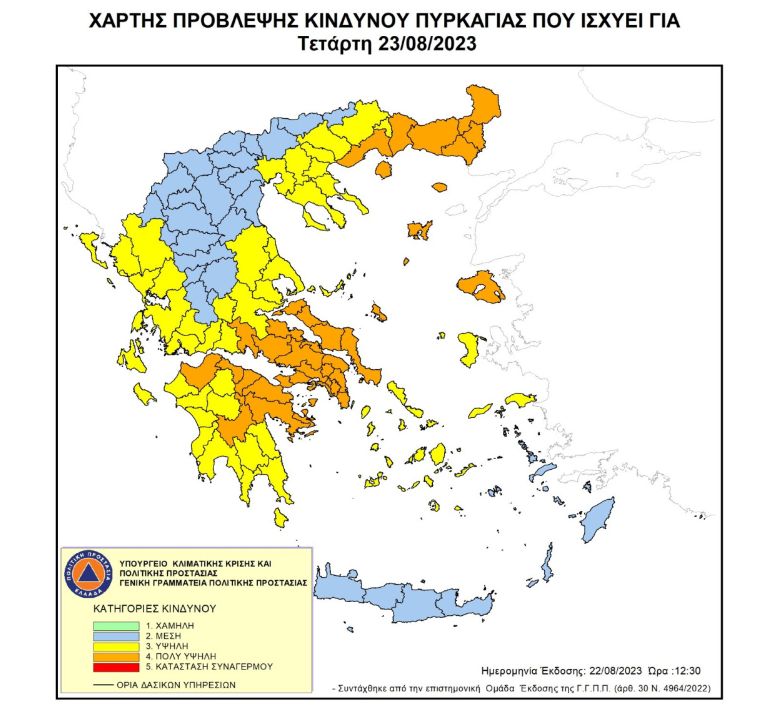 Υψηλός προβλέπεται να είναι ο κίνδυνος πρόκλησης πυρκαγιάς για αύριο, Τετάρτη 23 Αυγούστου 2023, σε Θεσσαλονίκη και Χαλκιδική, σύμφωνα με τον ημερήσιο χάρτη πρόβλεψης κινδύνου πυρκαγιάς.