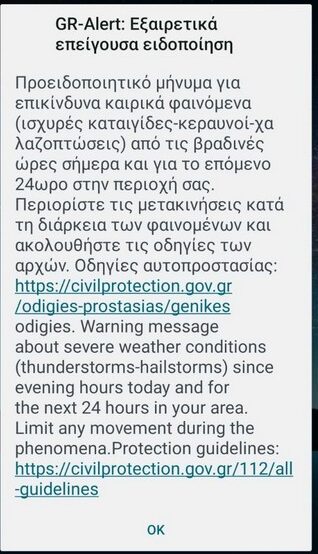 Το μήνυμα προειδοποιεί για «επικίνδυνα καιρικά φαινόμενα» από το μεσημέρι και εφιστά την προσοχή των κατοίκων.