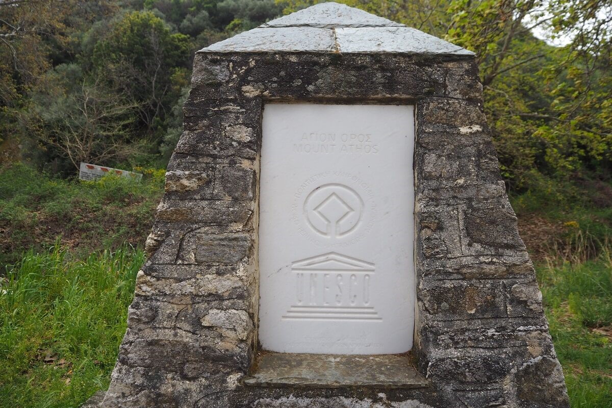 Ένα μνημείο, έξω από τη Μονή Ζυγού, μας υπενθυμίζει ότι η χερσόνησος του Αγίου Όρους είναι κηρυγμένη από το 1988 ως Μνημείο Παγκόσμιας Πολιτιστικής Κληρονομιάς της UNESCO και αποτελεί ένα από τα σημαντικότερα κέντρα ασκητικής ζωής σ’ ένα περιβάλλον ιδιαίτερου φυσικού κάλλους.