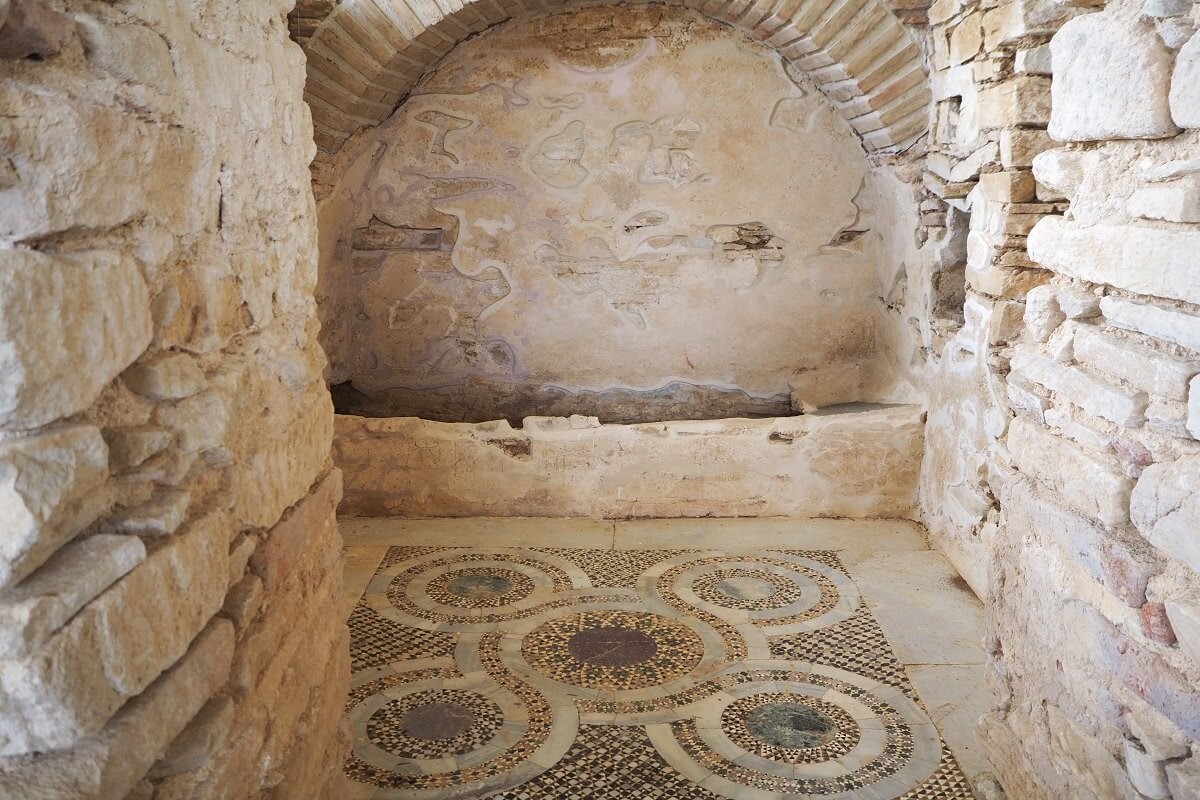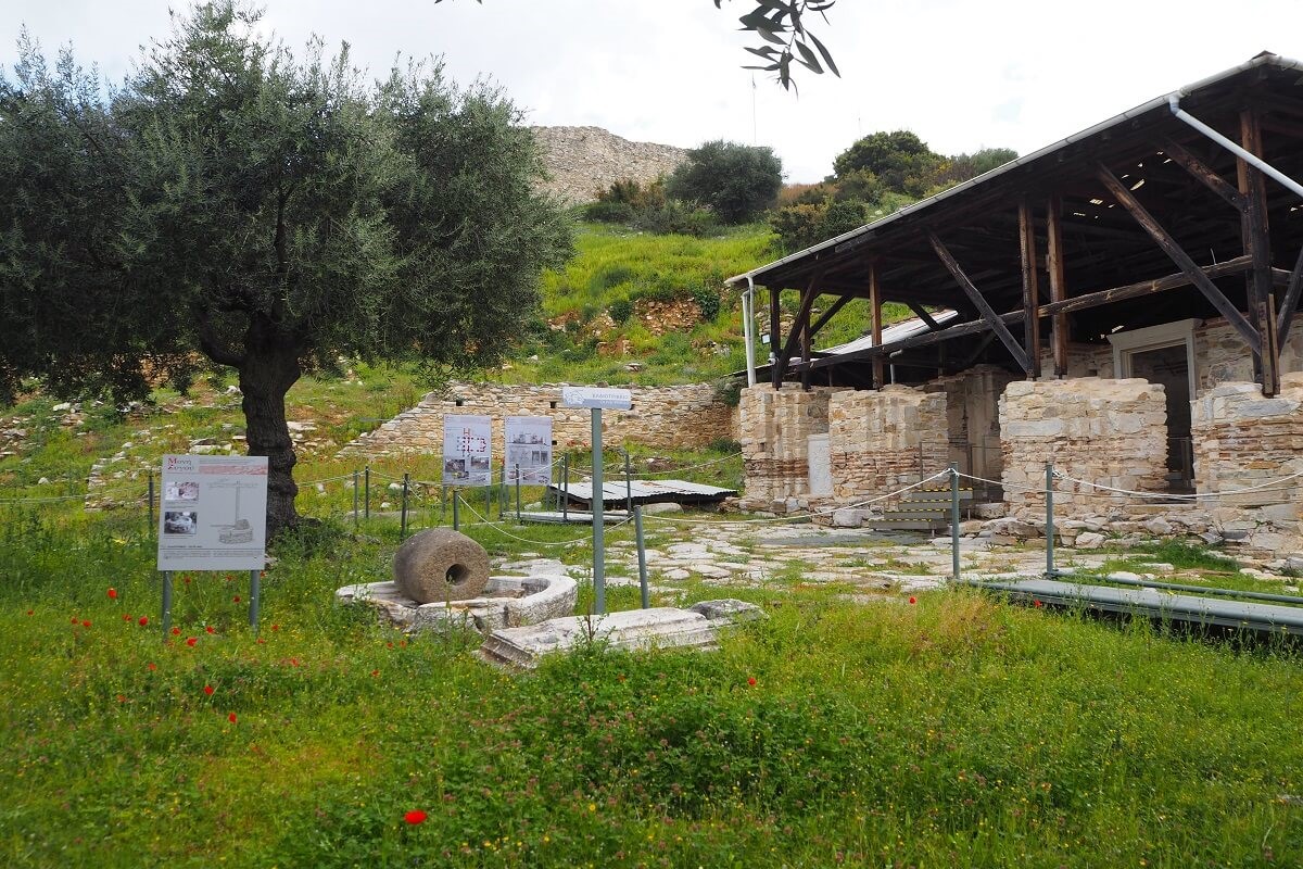 Δίπλα στην Τράπεζα και στον εξωνάρθηκα του Καθολικού βρέθηκε η γαλαιάγρα – το χειροκίνητο πιεστήριο.