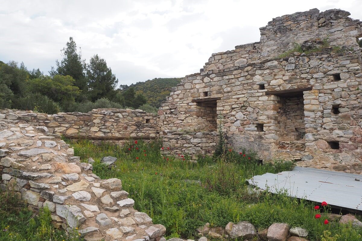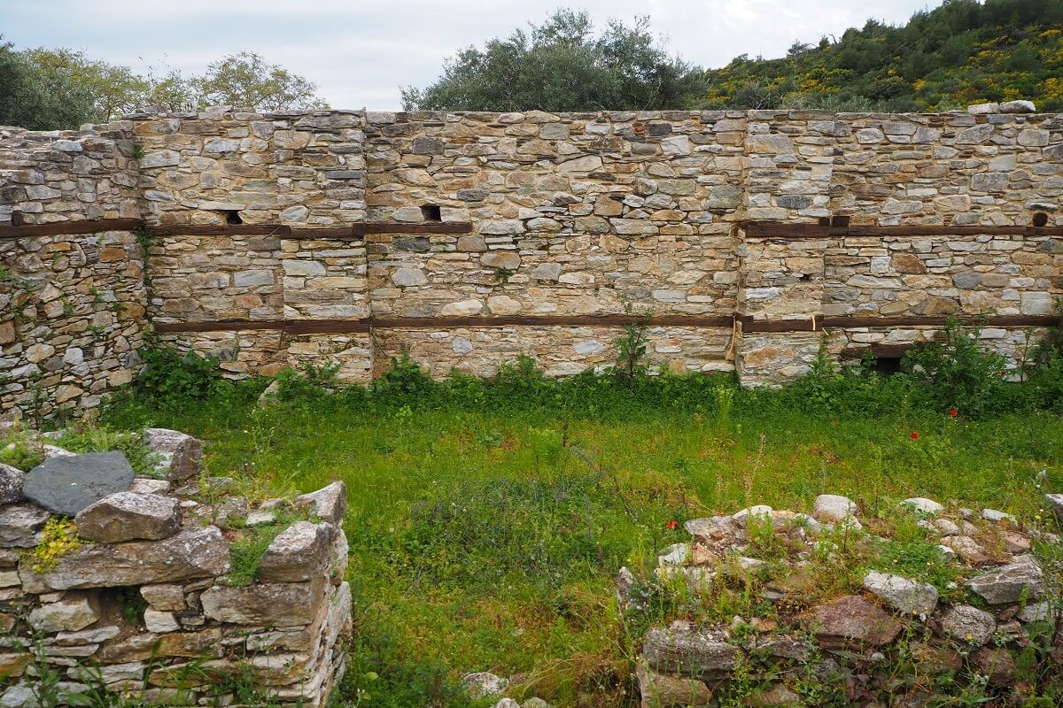 Το τείχος επίσης και το συρματόπλεγμα, μαζί και σχετική πινακίδα που αναγράφει ‘σύνορα’ μας πληροφορούν ότι βρισκόμαστε στα σύνορα με το Άγιον Όρος.
