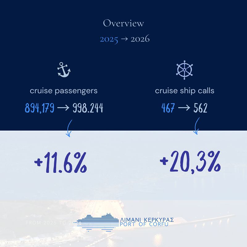 Σημειώνεται ότι βάσει στοιχείων του ΟΛΚΕ για το 2025 η Κέρκυρα υποδέχθηκε 467 κρουαζιερόπλοια και 894.179 επιβάτες.