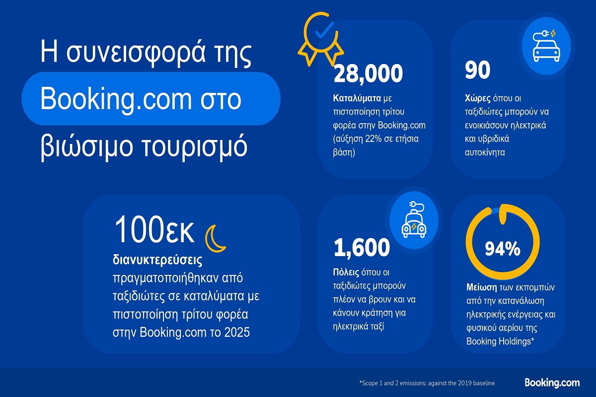 Δεν είναι μόνο θέμα πρόθεσης: στοιχεία που δημοσιεύτηκαν πρόσφατα δείχνουν ότι το 2025 οι ταξιδιώτες έκαναν κρατήσεις για 100 εκατομμύρια διανυκτερεύσεις σε καταλύματα με πιστοποίηση βιωσιμότητας από τρίτο φορέα μέσω Booking.com.