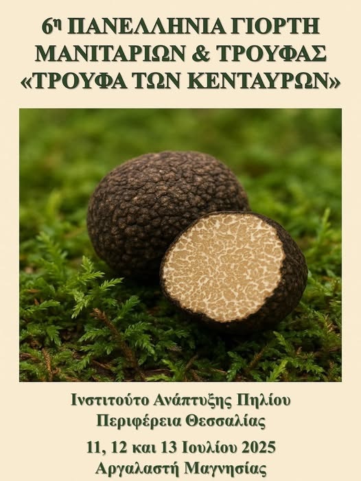 Αφορμή, η 6η Πανελλήνια Γιορτή Μανιταριών Τρούφας «Τρούφα των Κενταύρων», η οποία θα πραγματοποιηθεί στην Αργαλαστή, έδρα του Δήμου Νοτίου Πηλίου, από την Παρασκευή 11 έως και την Κυριακή 13 Ιουλίου 2025.