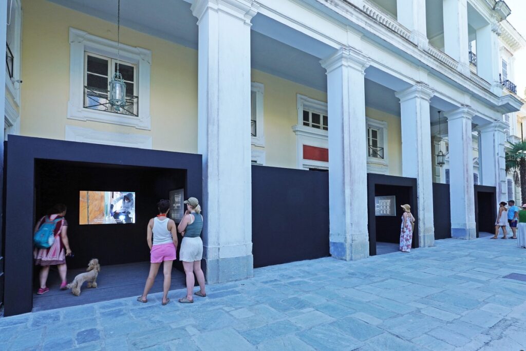 Στο πλαίσιο αυτό, διαμορφώθηκαν τρία black booths, μία τριγωνική οθόνη και μία πολυγωνική κατασκευή με σύγχρονο σχεδιασμό που πληροφορούν και ξεναγούν τους επισκέπτες στην ιστορία του Αχιλλείου Ανακτόρου, του κτιρίου και των διαμορφωτών του με πέντε υψηλής αισθητικής βίντεο παραγωγές.