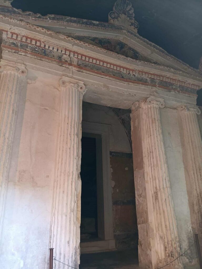 Πάνω από το γείσο αναπτύσσεται ο ‘δεύτερος όροφος’ της πρόσοψης. Αποτελείται από έξι μικρούς ιωνικούς ημικίονες με ύψος 1,46 μ., ανάμεσα στους οποίους υπάρχουν διαστήματα διαμορφωμένα ως ψευδόθυρες. Ανάμεσα στις δυο ακραίες παραστάδες και στους τέσσερις δωρικούς ημικίονες, που πλαισιώνουν τη θύρα, υπάρχουν τέσσερις ζωγραφικοί πίνακες, οι οποίοι αποτελούν ενιαία σύνθεση που απεικονίζει τη σκηνή της κρίσης του νεκρού: από αριστερά είναι ο νεκρός, στη συνέχεια ο Ερμής Ψυχοπομπός και δυο από τους τρεις κριτές του Κάτω Κόσμου – ο Αιακός και ο Ραδάμανθυς. (σ.σ. τρίτος κριτής ήταν ο Μίνως που λείπει από τη σύνθεση).