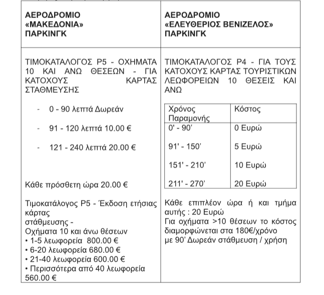 Συγκρίνοντας δε τις τιμές, μεταξύ του «Μακεδονία» και του Διεθνούς Αερολιμένα Αθηνών, επισημαίνεται πως στα πάρκινγκ του «Ελ. Βενιζέλος» οι τιμές είναι πολύ χαμηλότερες. Χαρακτηριστικό παράδειγμα, όπως αναφέρεται, είναι ότι το κόστος της ετήσιας κάρτας για χρήση του χώρου στάθμευσης των τουριστικών οχημάτων (P4) ανέρχεται σε μόλις180 ευρώ.