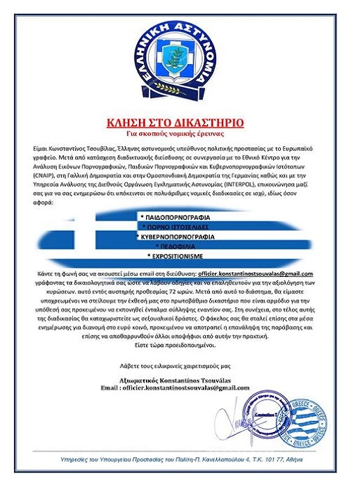 Σε σημερινό περιστατικό, οι δράστες, χρησιμοποιώντας εκ νέου τα στοιχεία του Γενικού Γραμματέα Δημοσίας Τάξης, Κωνσταντίνου Τσουβάλα, σε επιστολή- κλήση στο δικαστήριο με λογότυπο της Ελληνικής Αστυνομίας και στοιχεία του Υπουργείου Προστασίας του Πολίτη, προσπάθησαν να εξαπατήσουν συμπολίτες μας – χρήστες του διαδικτύου, με το πρόσχημα ότι βρίσκονται υπό έρευνα για δήθεν υπόθεση παιδικής πορνογραφίας και άλλων αδικημάτων.
