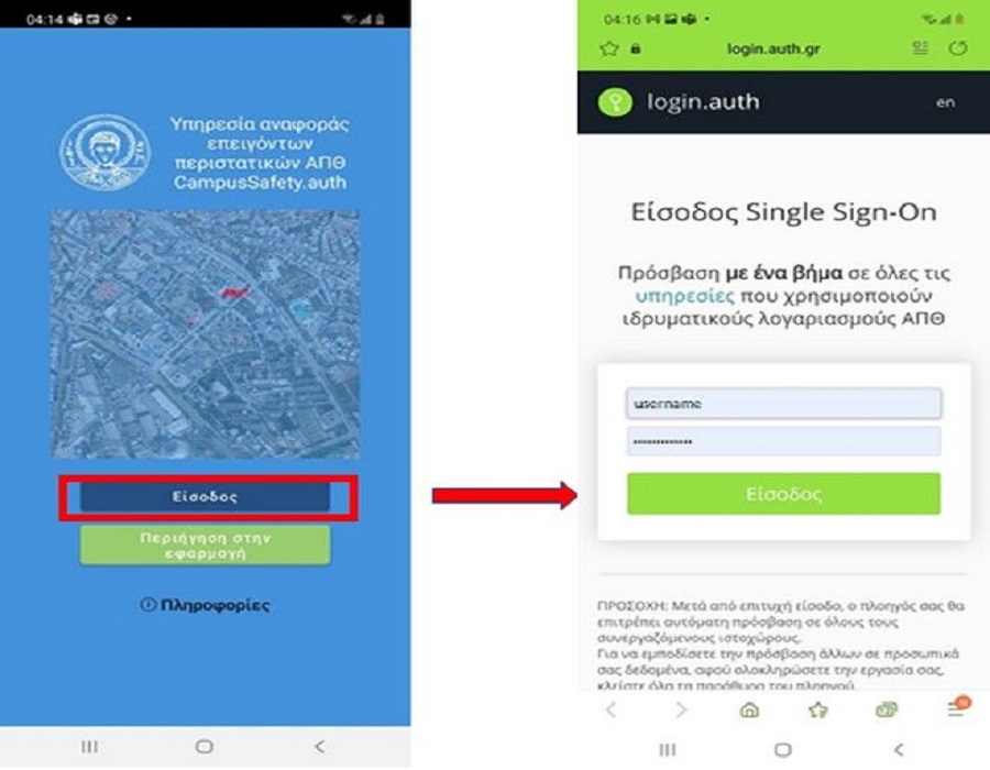 Για την πρόσβαση στην υπηρεσία αναφοράς επειγόντων περιστατικών, η εφαρμογή έξυπνων κινητών συσκευών απαιτεί την πιστοποίηση του χρήστη μέσω του ιδρυματικού του λογαριασμού. Η χρήση της υπηρεσίας είναι προαιρετική, ενώ το Πανεπιστήμιο συλλέγει μόνο τα δεδομένα που είναι απολύτως απαραίτητα για την εξυπηρέτηση του σκοπού της υπηρεσίας.