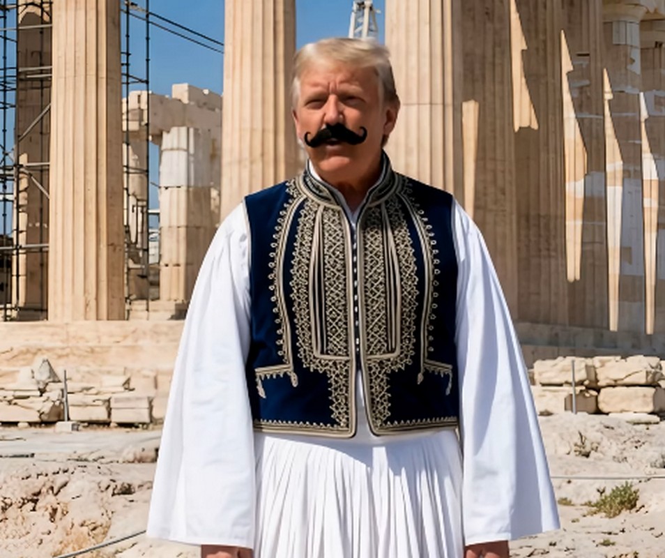 Δημιούργημα τεχνιτής νοημοσύνης παρουσιάζει τον Ντόναλντ Τραμπ, με μουστάκι και φουστανέλα, να ξεδιπλώνει την κατακτητική του διάθεση, βάζοντας στο κάδρο και την Ελλάδα.