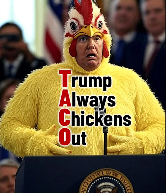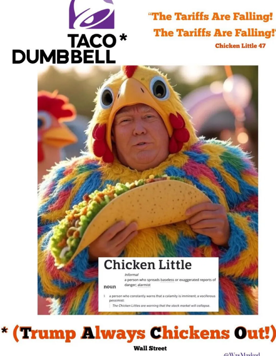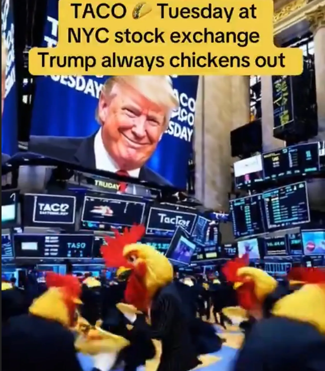 Ο όρος είναι «TACO», που είναι κωδικός για «Trump Always Chickens Out» (Ο Τραμπ πάντα δειλιάζει σαν κότα) αναφέρεται στην τάση του προέδρου να ανακοινώνει τεράστιους δασμούς, προκαλώντας την κατάρρευση των αγορών, για να κάνει πίσω λίγες μέρες αργότερα, προκαλώντας την άνοδό τους.