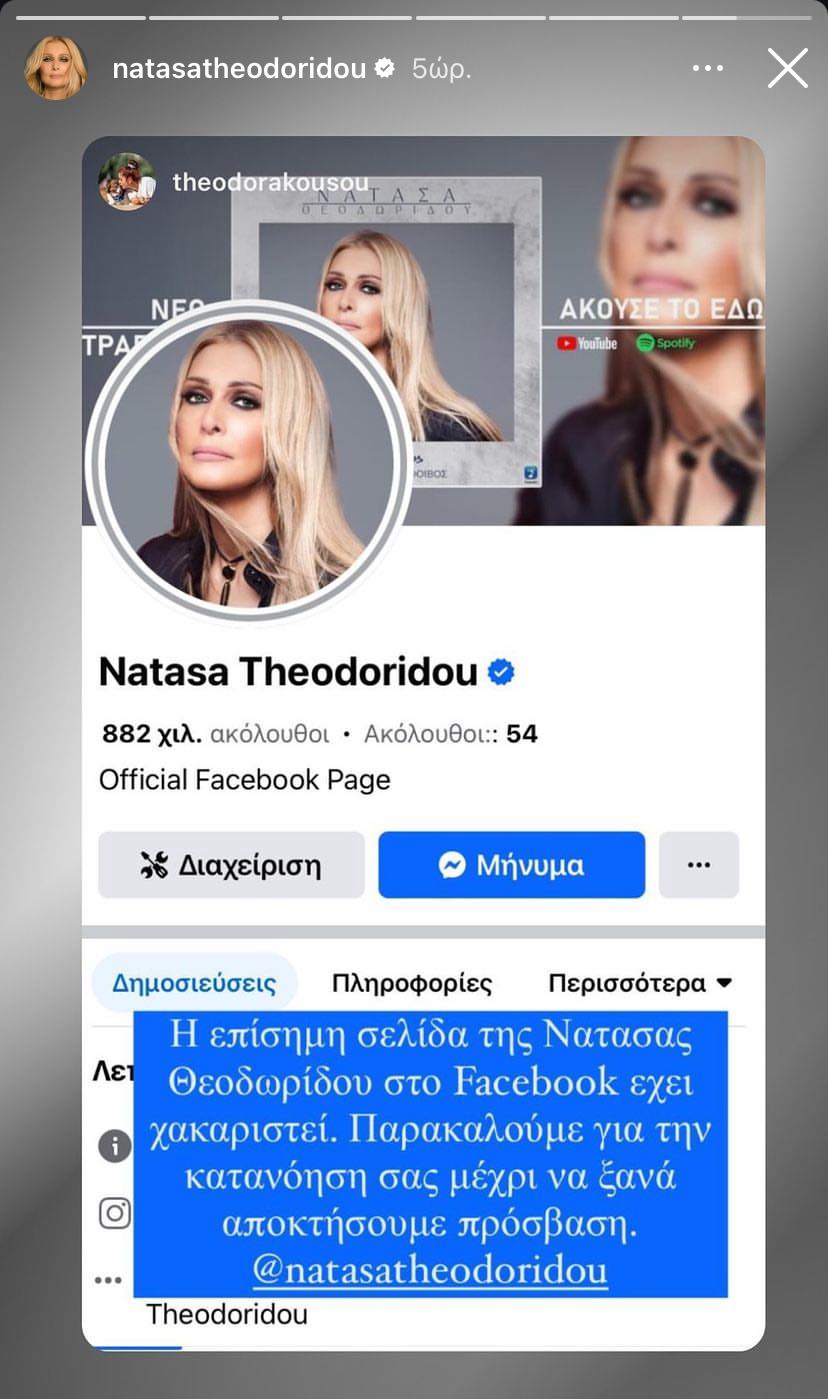 «H επίσημη σελίδα της Νατάσας Θεοδωρίδου στο Facebook έχει χακαριστεί. Παρακαλούμε για την κατανόησή σας μέχρι να αποκτήσουμε πρόσβαση ξανά» αναγράφεται συγκεκριμένα σε αυτό.