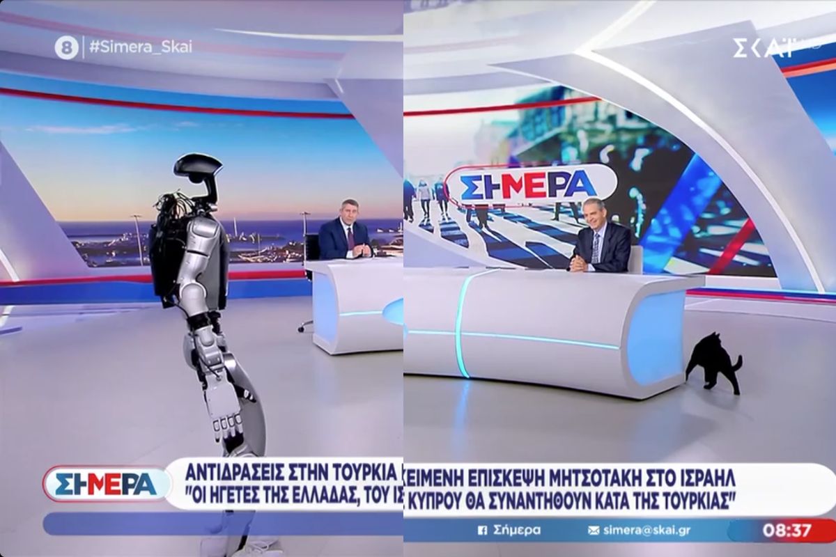 Αναστάτωση φαίνεται να προκάλεσε η παρουσία του ρομπότ «Σοφία» στο πλατό του ΣΚΑΪ, καθώς ο γάτος Μπάρακ της εκπομπής «Σήμερα» τρόμαξε όταν την αντιλήφθηκε στον χώρο.